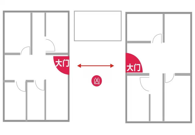 大门对大门,易形成“一门兴旺一门衰”的格局,导致事业发展受阻,难有起色;若大门对大门时,大门在东北方、正西方,家中少男、少女较为叛逆,学业上难有进步。