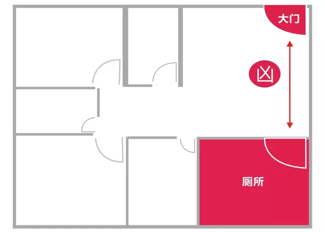 大门为入气口,厕所为秽气之地,两者相对,易形成秽气迎人的现象,导致事业上鲜有贵人帮助,工作进展缓慢;若大门对厕所时,大门在东北方、正西方,则家中少男、少女易人缘不佳,学习不在状态。